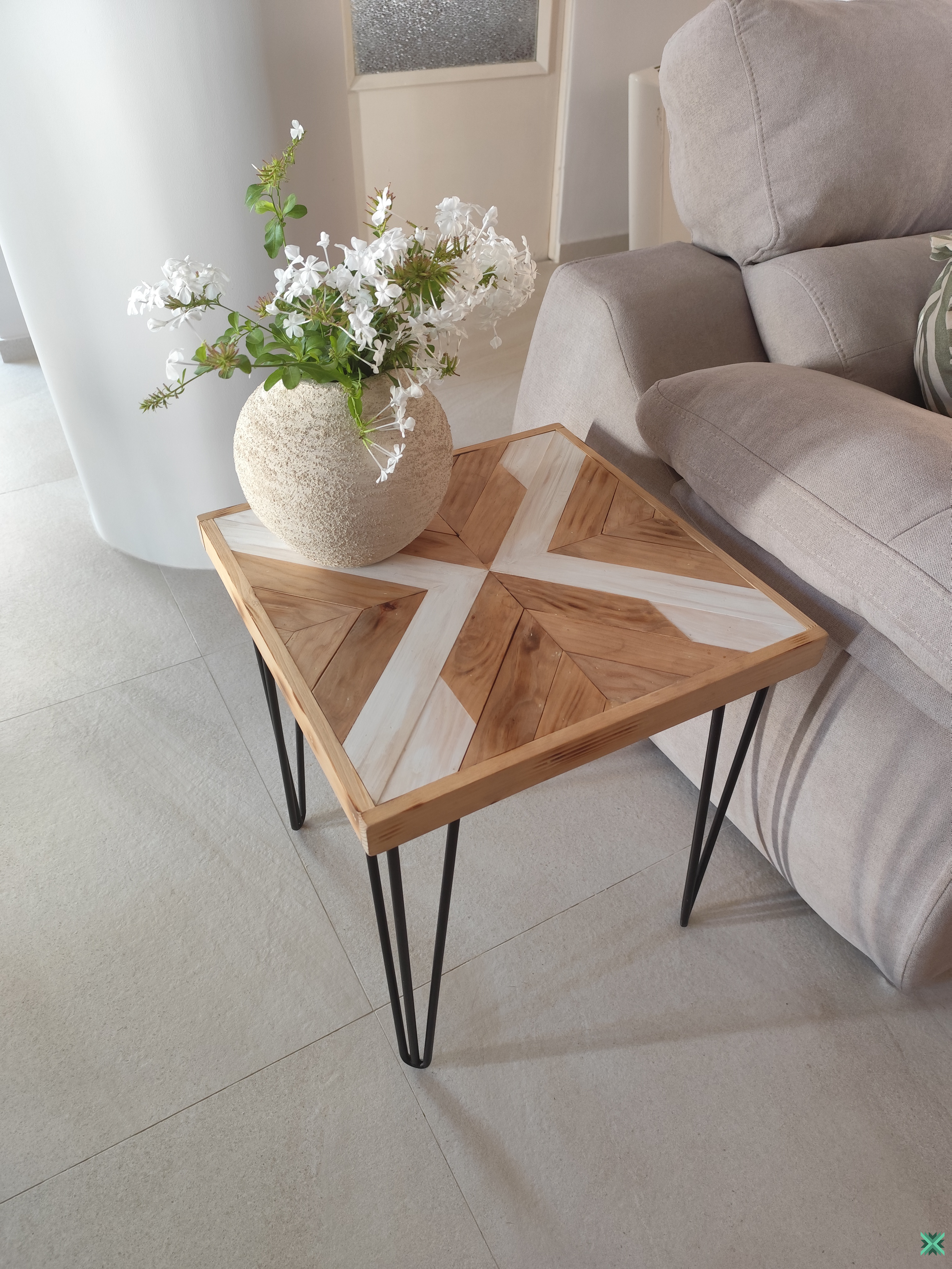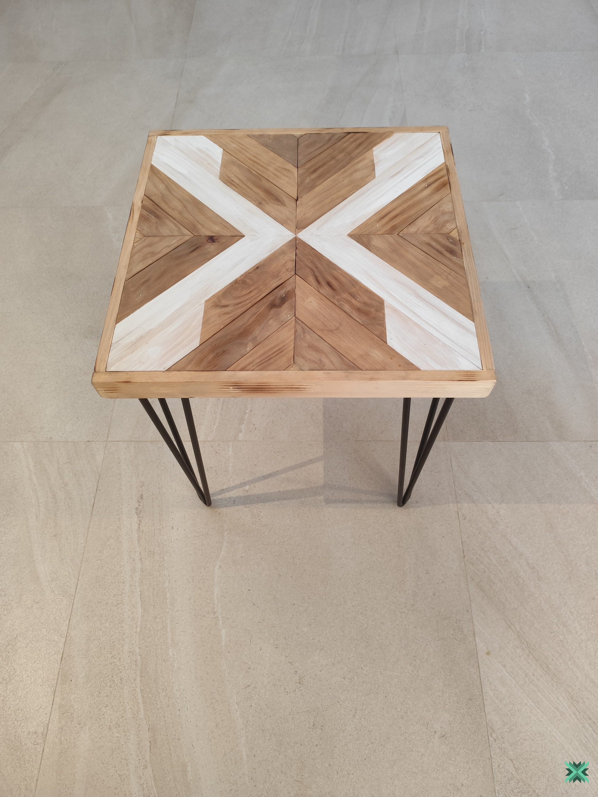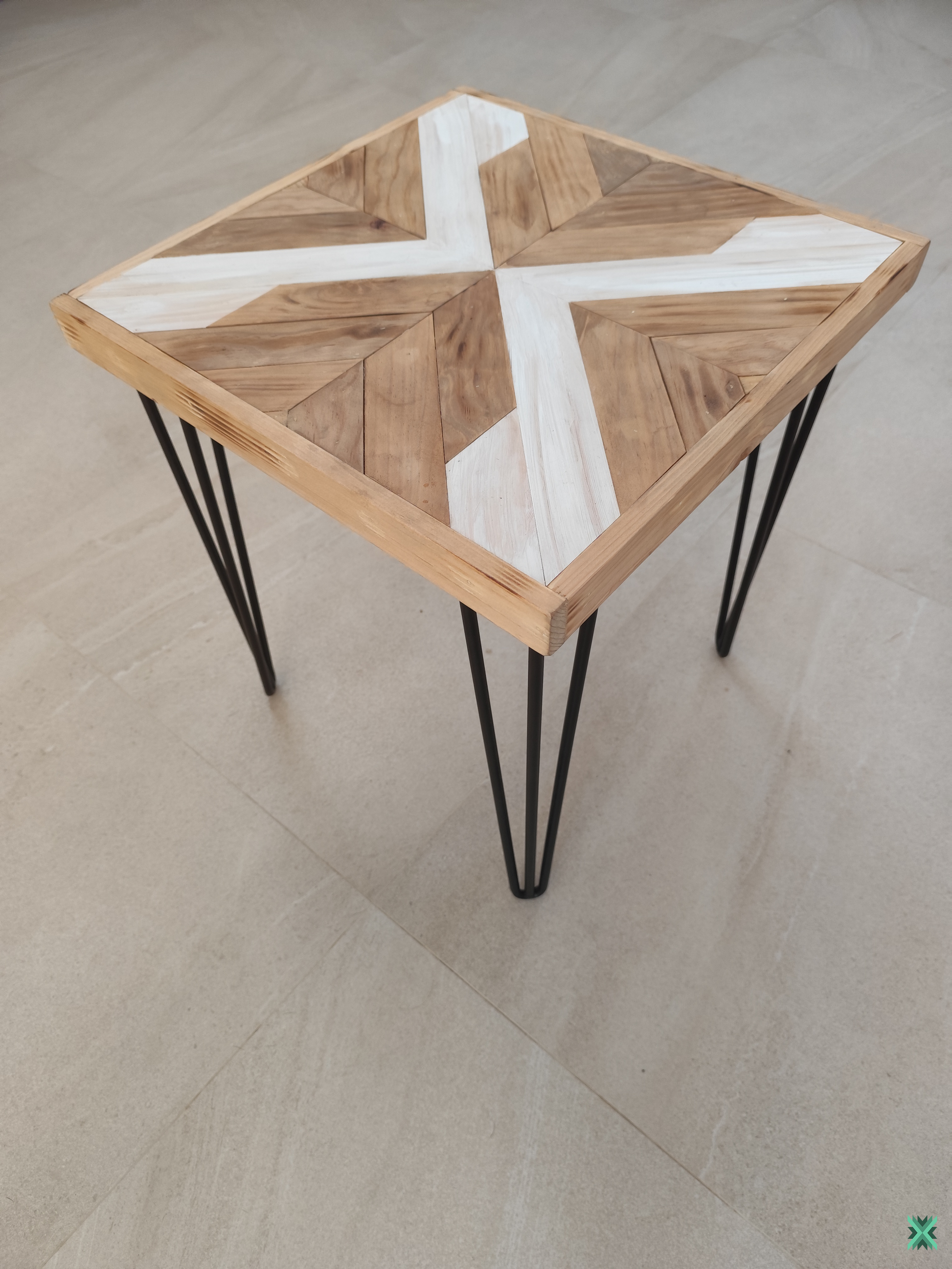 Mesita de diseño confeccionada con madera de pino. Cada componente de esta exclusiva mesa es meticulosamente seleccionado, considerando la veta, los nudos y otras características "imperfectas" de la madera, las cuales son tratadas individualmente con tintes naturales y pinturas y diversas técnicas mecánicas.