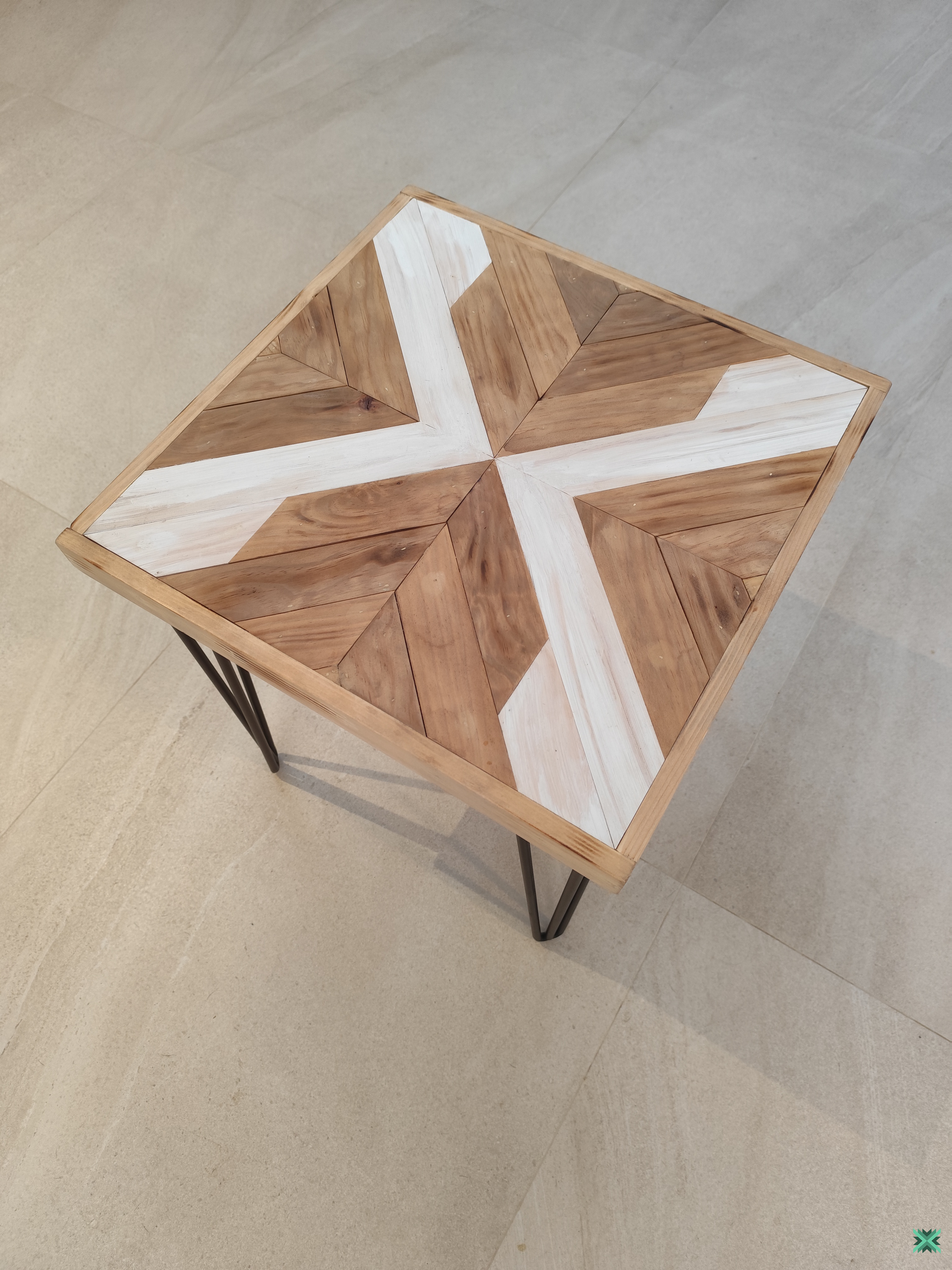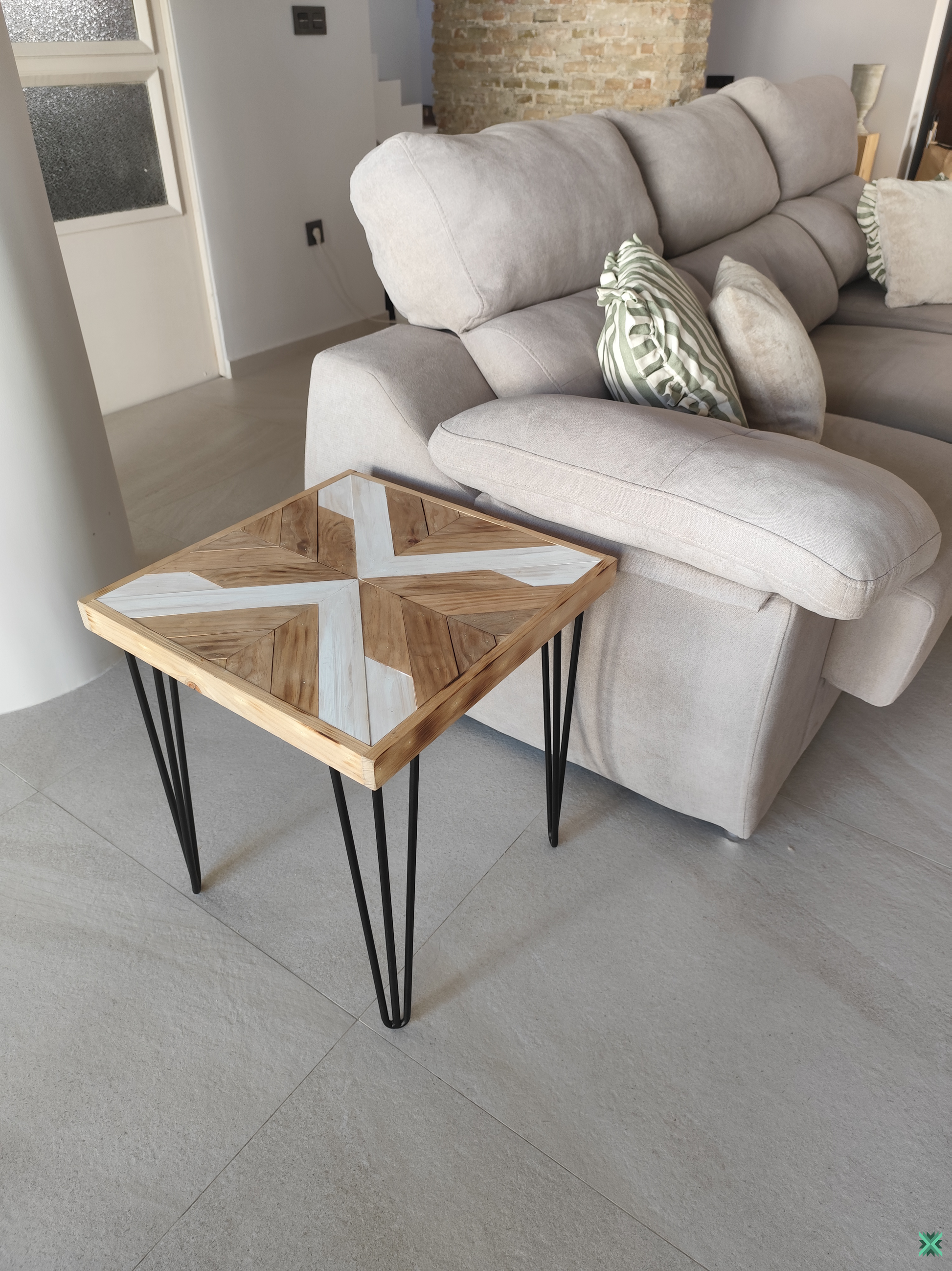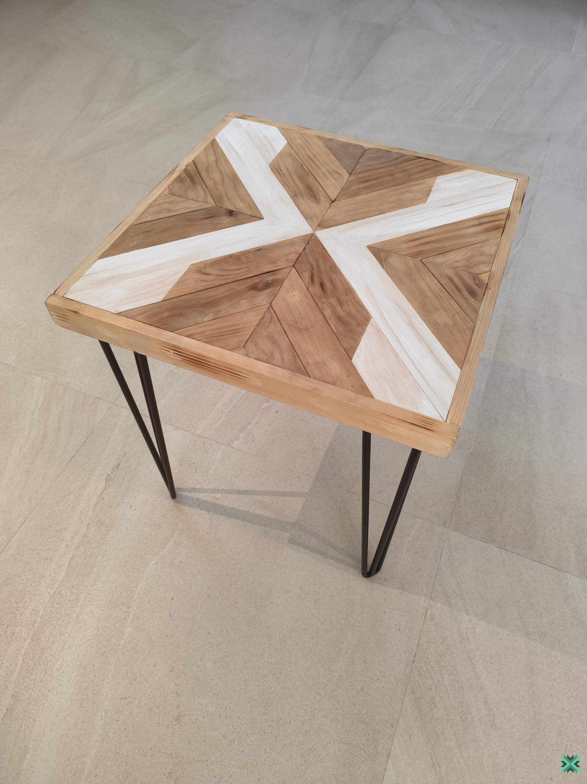 Mesita de diseño confeccionada con madera de pino. Cada componente de esta exclusiva mesa es meticulosamente seleccionado, considerando la veta, los nudos y otras características "imperfectas" de la madera, las cuales son tratadas individualmente con tintes naturales y pinturas y diversas técnicas mecánicas.