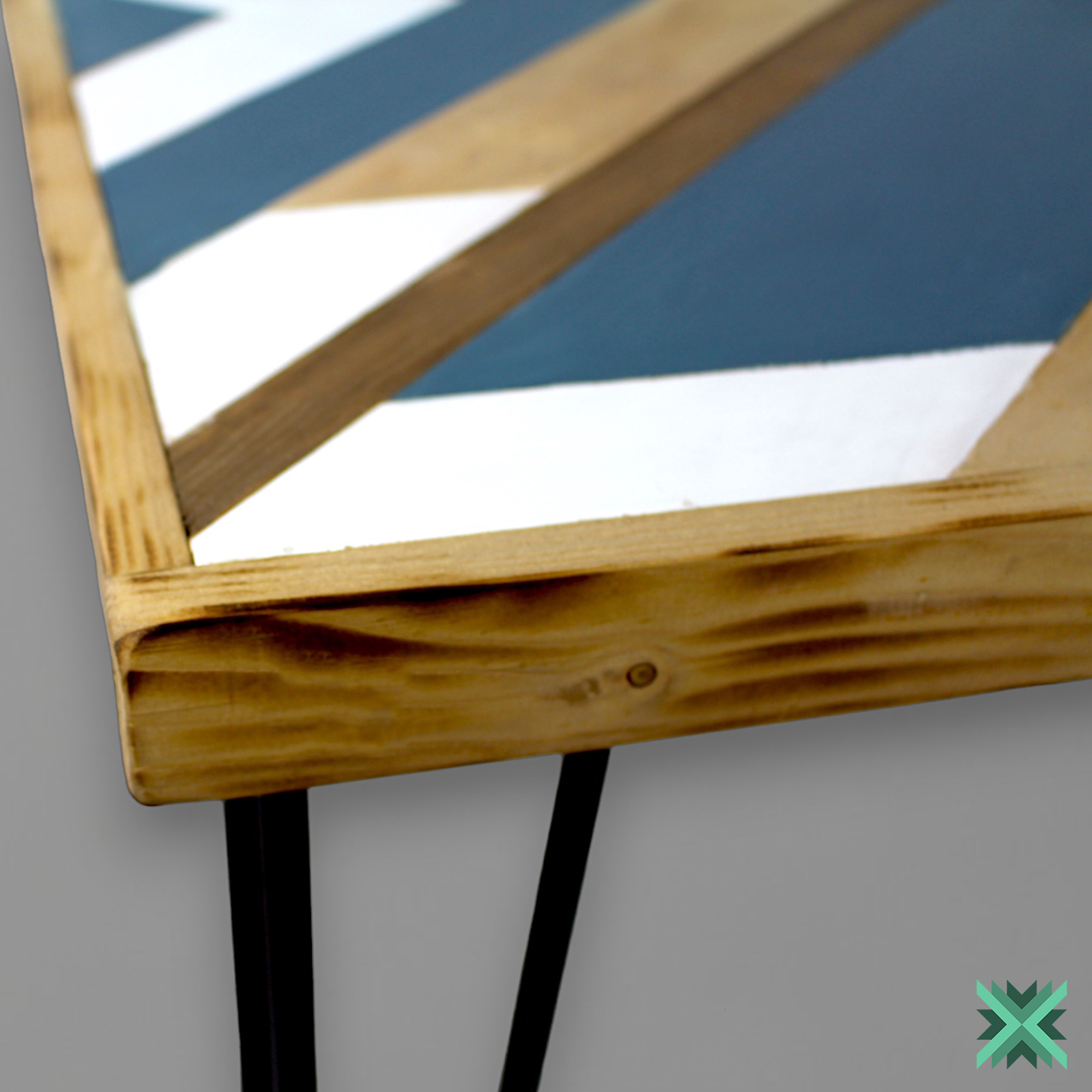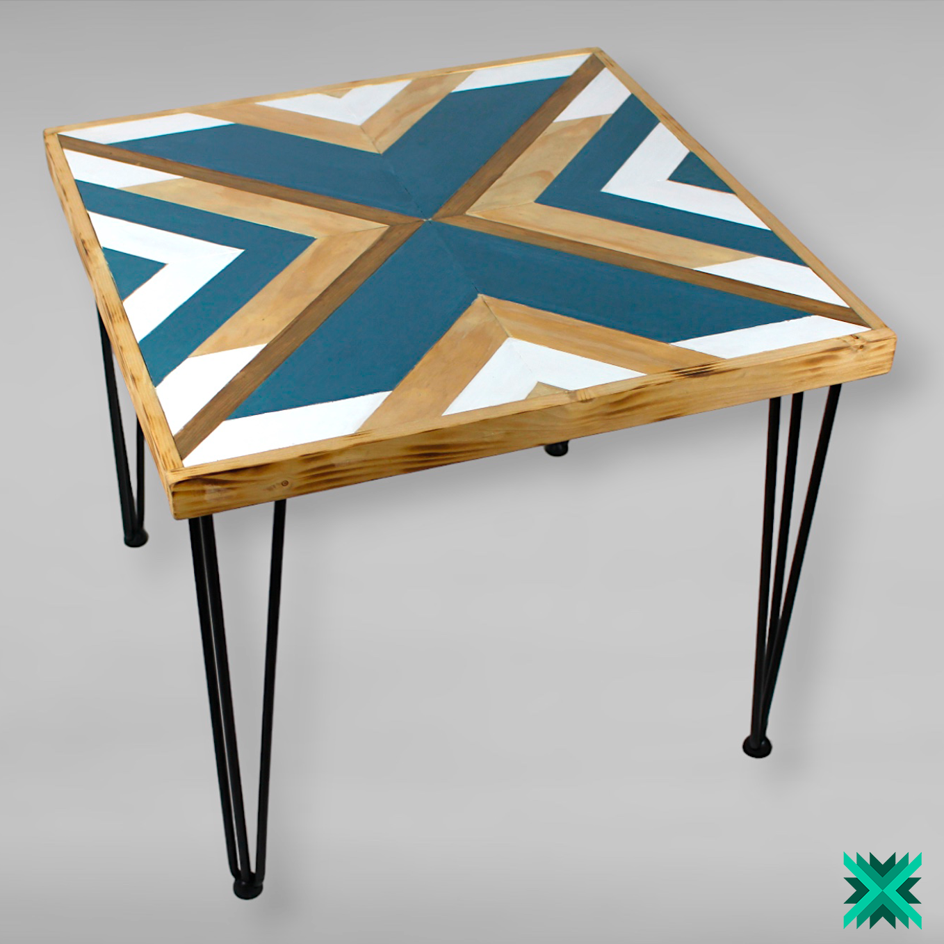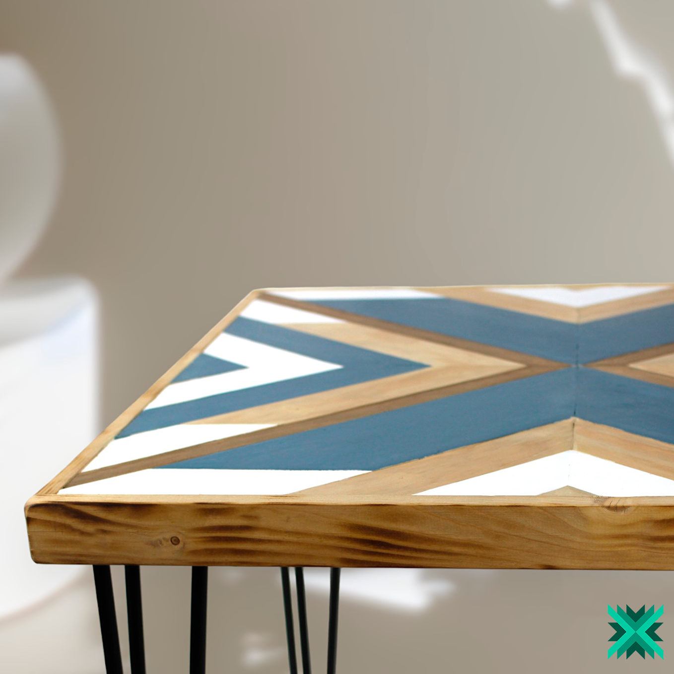 Mesita de diseño confeccionada con madera de pino. Cada componente de esta exclusiva mesa es meticulosamente seleccionado, considerando la veta, los nudos y otras características "imperfectas" de la madera, las cuales son tratadas individualmente con tintes naturales y pinturas y diversas técnicas mecánicas.